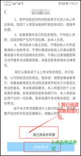 1.點擊“考試”按鈕,閱讀并同意考生承諾后進行打鉤,點擊“開始考試”,請提前將手機設置為勿擾模式,切屏超過次數和時長將視為作弊。