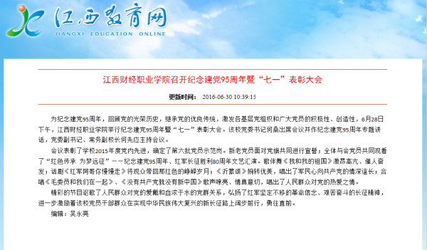 6月30日,江西教育網(wǎng)報道我校召開慶祝建黨95周年暨“七一”表彰大會。