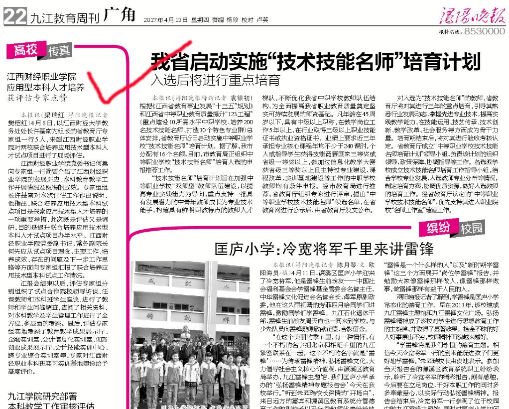 4月13日,《潯陽晚報》九江教育周刊報道省教育廳對我校應(yīng)用型本科人才培養(yǎng)工作進(jìn)行評估。