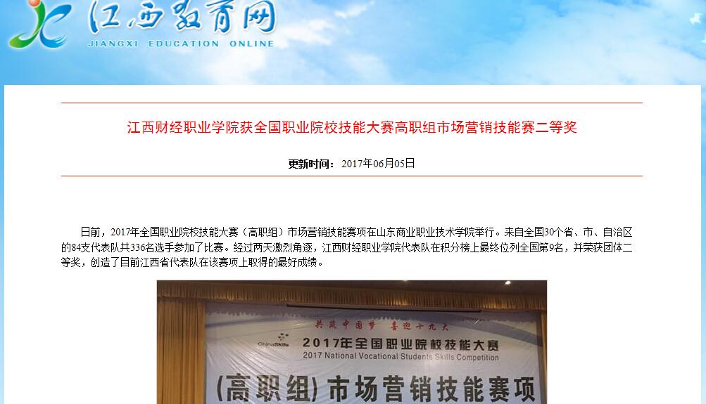 6月5日,江西教育網(wǎng)報道我院在2017年全國職業(yè)院校技能大賽高職組市場營銷技能賽中榮獲團體二等獎。