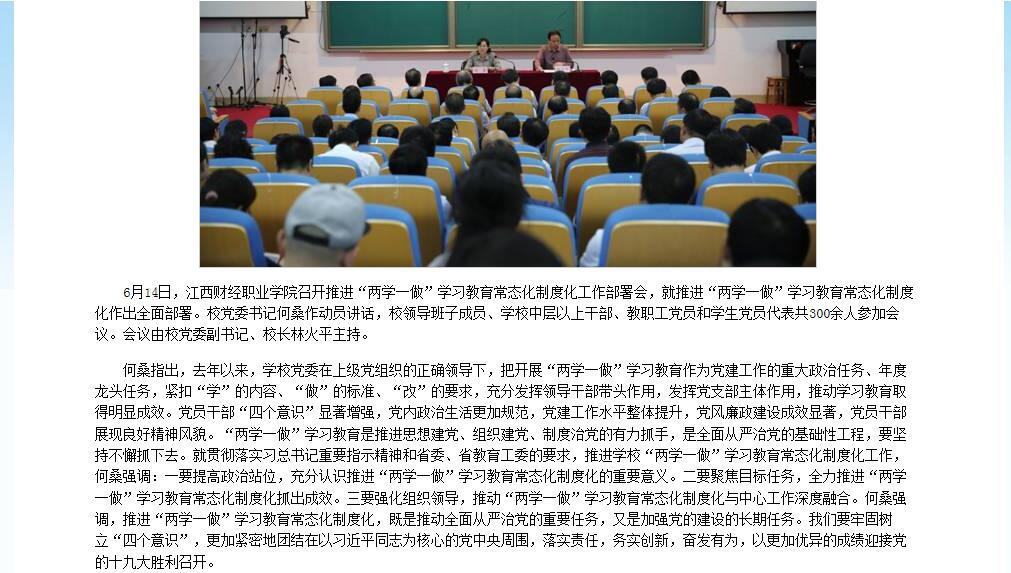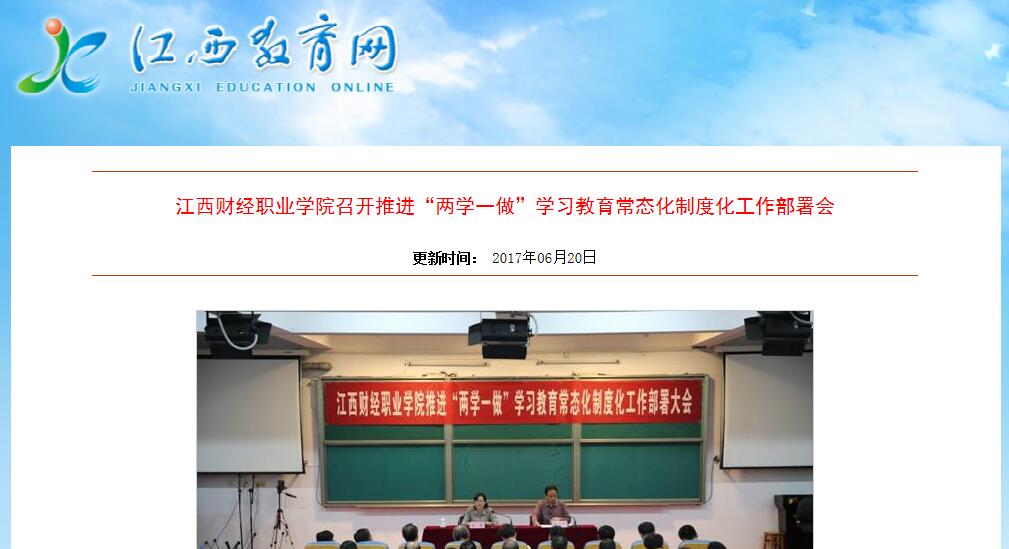 6月20日,江西教育網(wǎng)報(bào)道我院召開(kāi)推進(jìn)“兩學(xué)一做”學(xué)習(xí)教育常態(tài)化制度化部署會(huì)。