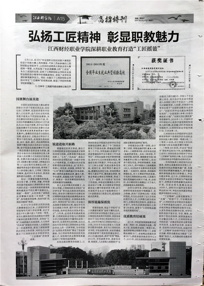 6月24日,《江南都市報》在A15版“高招特刊”欄目刊發《弘揚工匠精神 彰顯職教魅力》一文,報道我校大力發展現代職業教育,弘揚工匠精神,在提升學生創新創業能力方面取得優異成績。