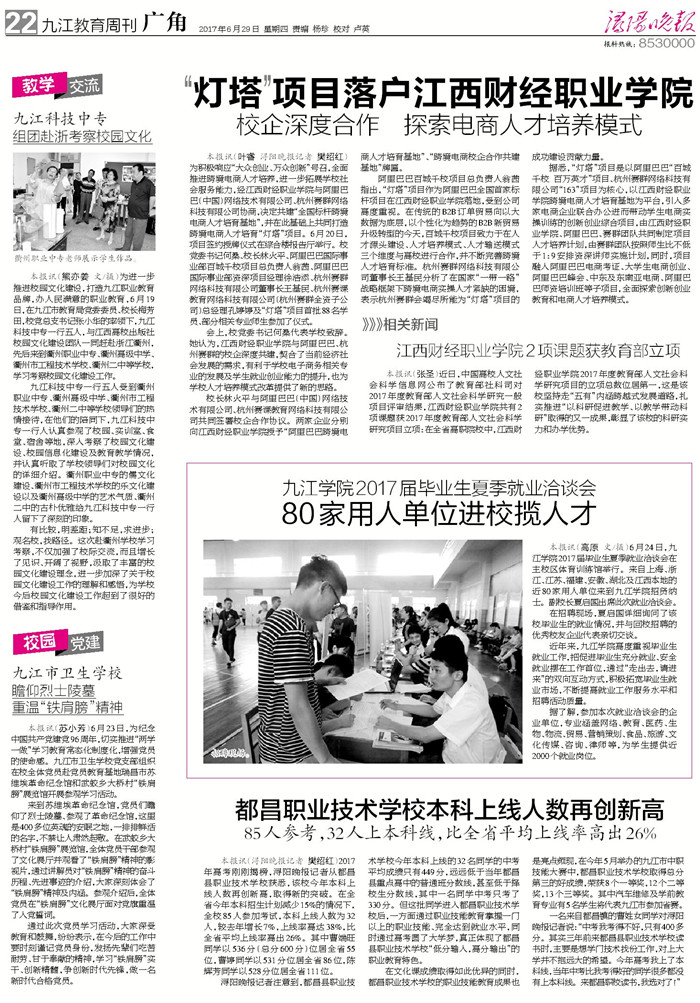 6月29日,潯陽晚報報道我院與阿里巴巴公司合作實施“燈塔”項目,開展電商人才培養(yǎng)。