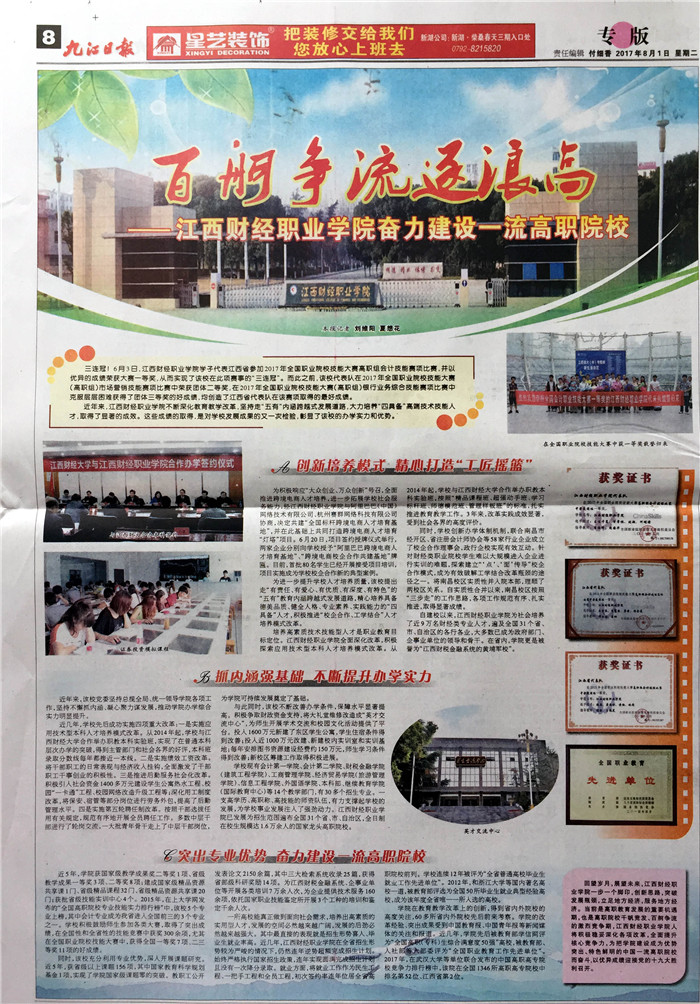 8月1日,《九江日報》在第8版刊發(fā)《百舸爭流逐浪高——江西財經(jīng)職業(yè)學院奮力建設一流高職院校》一文,報道我校堅持走“五有”內涵跨越式教育發(fā)展道路,深化教育教學改革,在人才培養(yǎng)方面取得優(yōu)異成績。