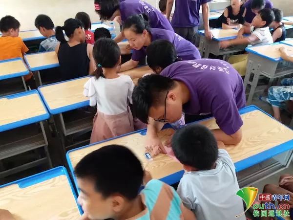 趣味英語課堂上,隊員們指導孩子們將自己的夢想寫在心愿卡上(中國青年網通訊員 邱大林 提供)