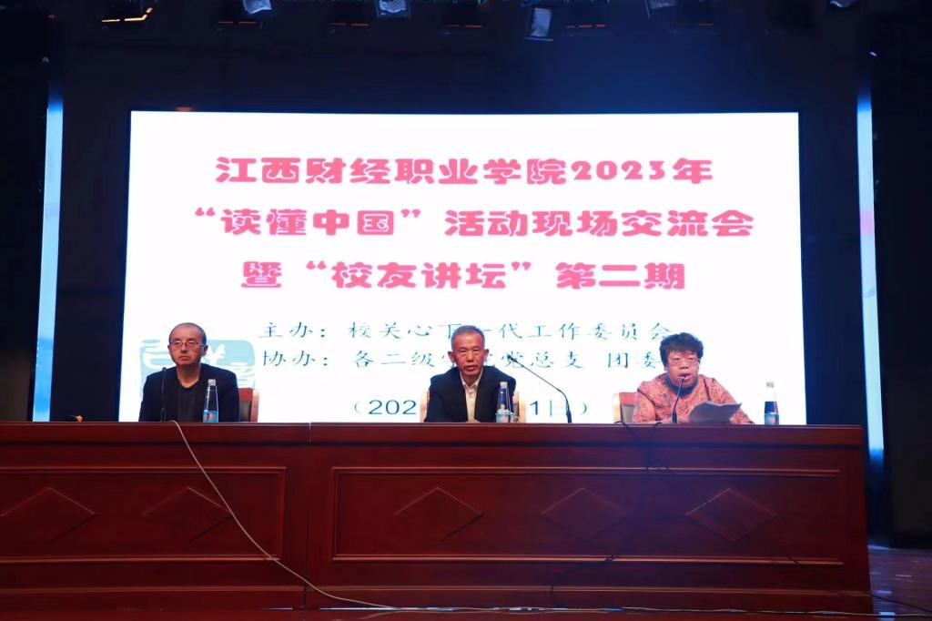 為向廣大青年學生宣講黨的二十大精神,教育和激勵學生在新的征程上立志做有理想、敢擔當、能吃苦、肯奮斗的新時代青年,2023年5月11日下午4:30校關工委在英才交流中心舉辦了“老少共話二十大 踔厲奮斗新征程”為主題的2023年“讀懂中國”活動現場交流會暨“校友論壇”第二期活動。兩位優秀老校友代表原江西省九江第一中學副校長、77級財政班的柯于生和原國家稅務總局鷹潭市稅務局副調研員、全國稅務系統先進工作者、全國五一巾幗標兵、81級稅收班的艾華英在現場與我校參加2023年“讀懂中國”活動征文寫作和微視頻制作的青年學生進行了深入交流。