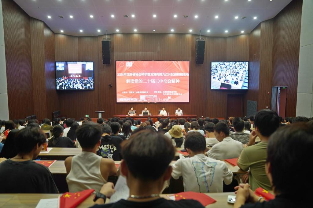 為深入學習貫徹黨的二十屆三中全會精神,幫助青年大學生更好地了解掌握黨的二十屆三中全會精神實質和豐富內涵,動員引領廣大青年凝心聚力,奮發進取,9月30日下午,我校聯合九江市社會科學界聯合會共同舉辦2024年江西省社會科學普及宣傳周九江片區進校園活動。此次活動邀請了九江市委黨校劉安爐教授在行政樓第二報告廳作了黨的二十屆三中全會精神宣講專題報告。九江市社會科學界聯合會周建灃部長、城鄉建設學院黨總支書記胡紅霞、馬克思主義學院黨總支副書記熊曉蘭以及2024級城鄉建設學院學生共計240余人參加了報告會。報告會由熊曉蘭主持。